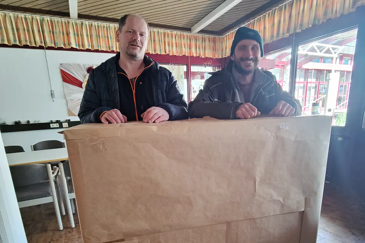 Unser Hausmeister Herr Eichhorn und sein Helfer Herr Trost holten das gut verpackte Regal vormittags von der Olgakrippe ab und Frau Jäger enthüllte es Schicht für Schicht, bis alle tollen Motive sichtbar waren.